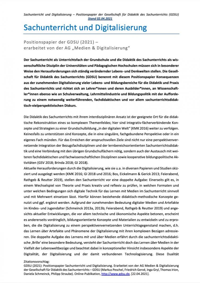 • Beiträge zum Positionspapier Sachunterricht und Digitalisierung der GDSU